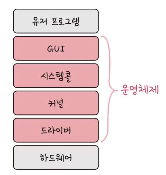 - 커널: 프로세스 관리, 메모리 관리, 저장장치 관리 등 운영체제의 핵심적인 기능을 모아놓은 것