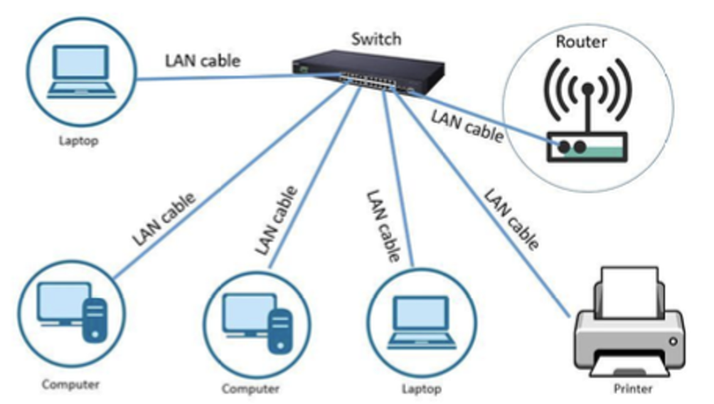 - MAN, WAN보다 높은 안정성과 속도를 가지며 보통 허브나 스위치로 연결된 소규모 네트워크를 의미한다.