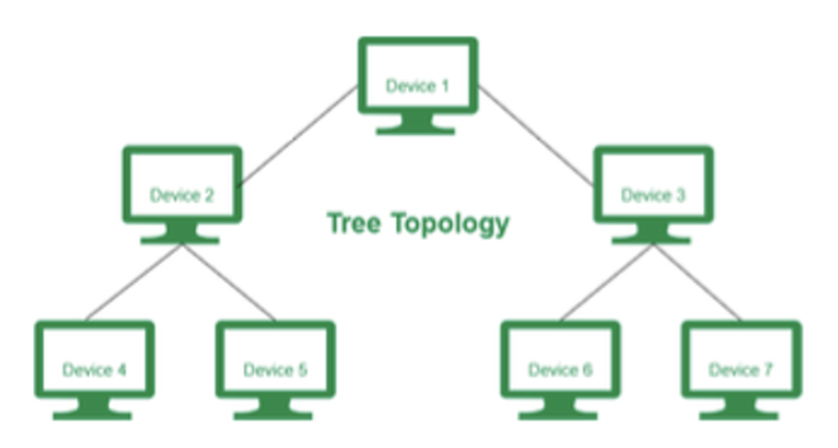 버스 토폴로지와 스타 토폴로지의 하이브리드 구조로 계층적으로 연결되어있다.