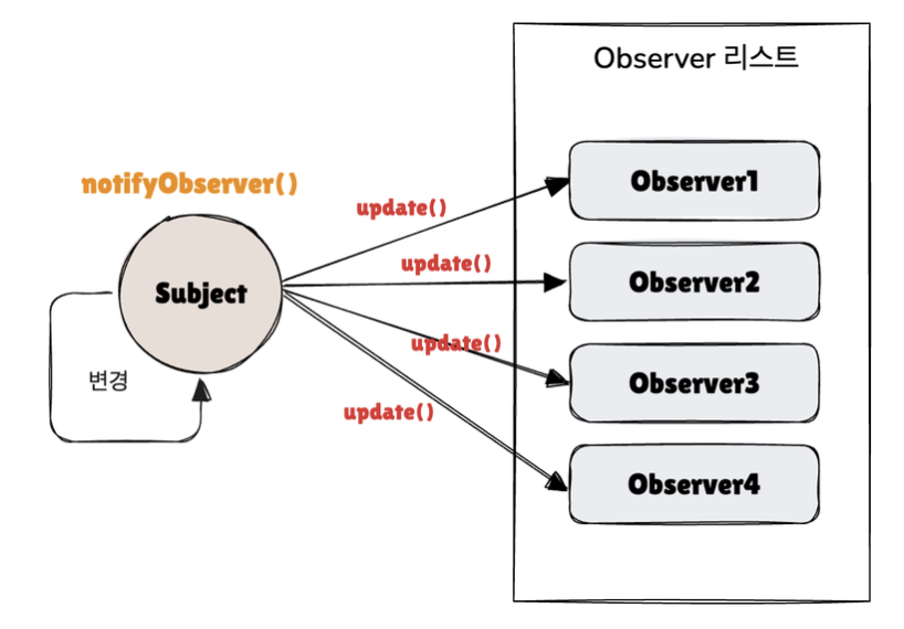 - 관찰 대상인 Subject 상태가 변경되면 Observer에게 변경 사항을 통보한다. ⇒ notifyObserver()